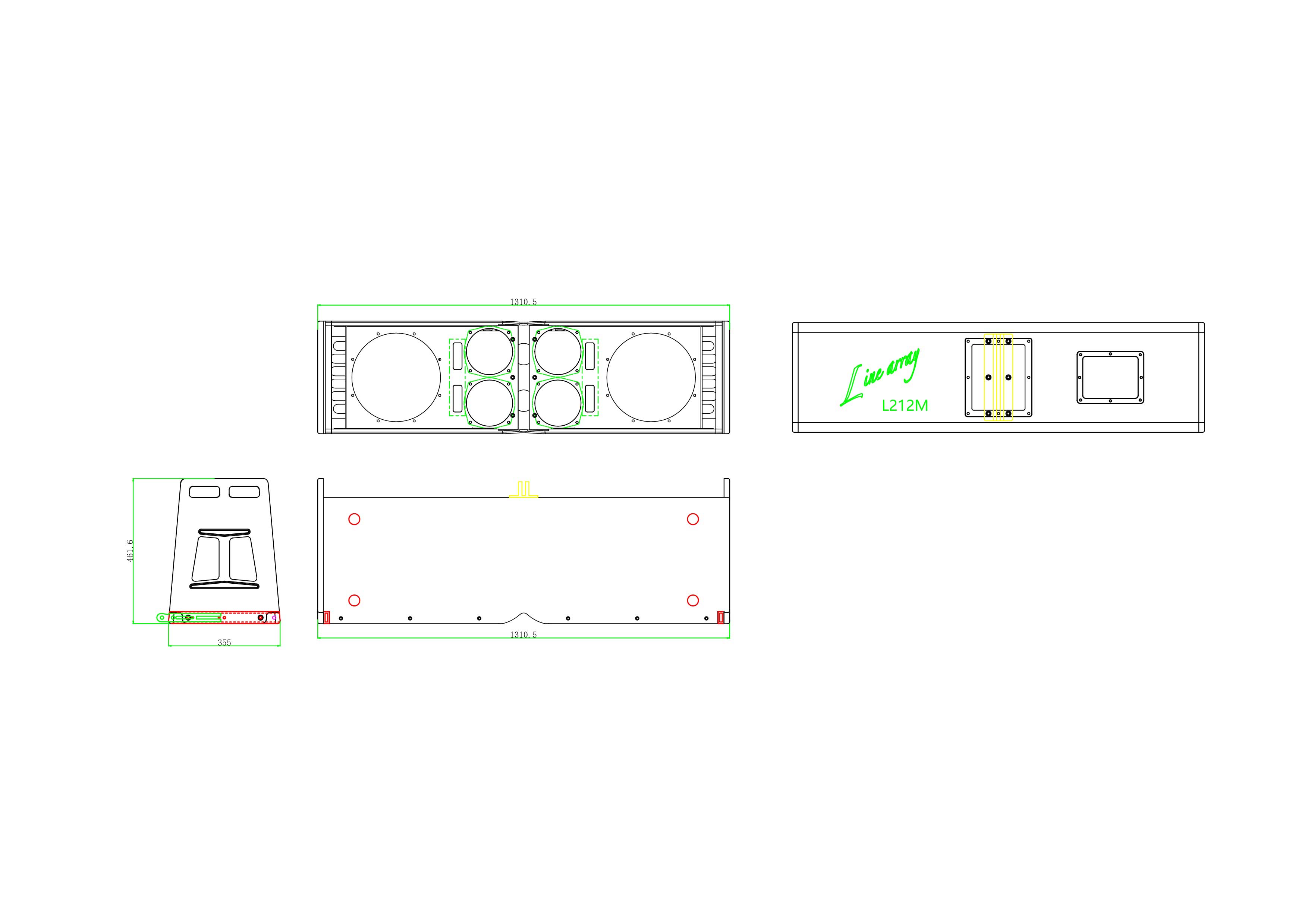 L212M线阵列音箱是一个大型的3路驱动的三分频系统。提供60Hz-20KHz的频率范围。两个75mm(音圈)的钕磁压缩单元,4个6.5寸钕磁中音单元加上两个12寸钕磁低音单元构成一个动态余量极大的组合。