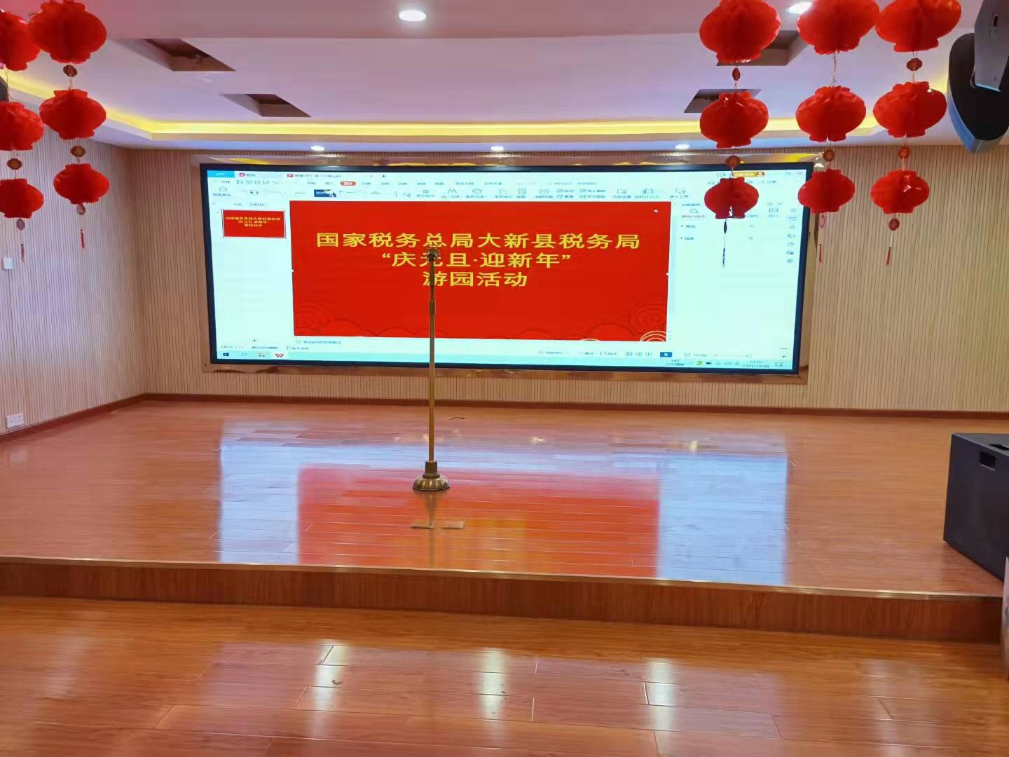 元旦当天,活动室内添置了满满的喜庆红灯笼,位于银幕下的讲台,四周配置了现场必不可少的专业音响,现场活动环节精彩不断,气氛热情高涨。